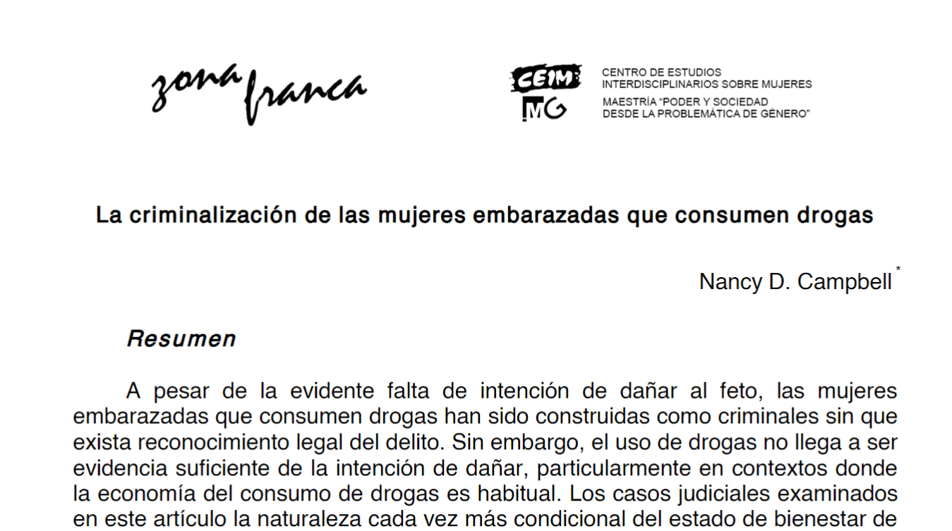 Campbell, Nancy D. (2019) “La criminalización de las mujeres embarazadas que consumen drogas,” Traducción de Mara Dicenta, Zona Franca 27: 320-341