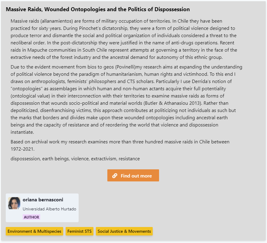 What does it mean to engage in “good relations” in worlds that unfold after violence and destruction? How does STS respond to wounded worlds? This panel interrogates the vitalities of destruction not from universalist standpoints but from the politics wounded knowledges, ecologies of practice, and geographies demand. We seek a feminist contribution that acknowledges how technoscience is not only situated but also traced, marked, and haunted by histories and stories of violence and displacement.