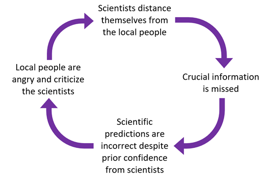 This arrogance theory is a self-perpetuating side effect of the colonization of science. With more emphasis on the experts and avoiding traditional ecological knowledge (TEK) and local knowledge, science is distanced from the local and native people (Trisos, Auerbach, & Katti, 2021). This distancing limits the gaining of knowledge, ultimately failing to fulfill what is often regarded as the goal of science in general. As science ignores the TEK and local knowledge, local people are often negatively affected and begin to distrust the scientists, especially when their claims were initially backed up by so much confidence (Wynne, 1992).